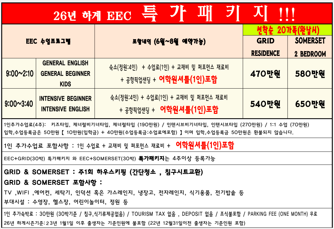 | EEC 수업프로그램 | 포함내역 선웨이 호텔 30박 31일 기준, 수업 4주 기준 | 4주 특가 | |